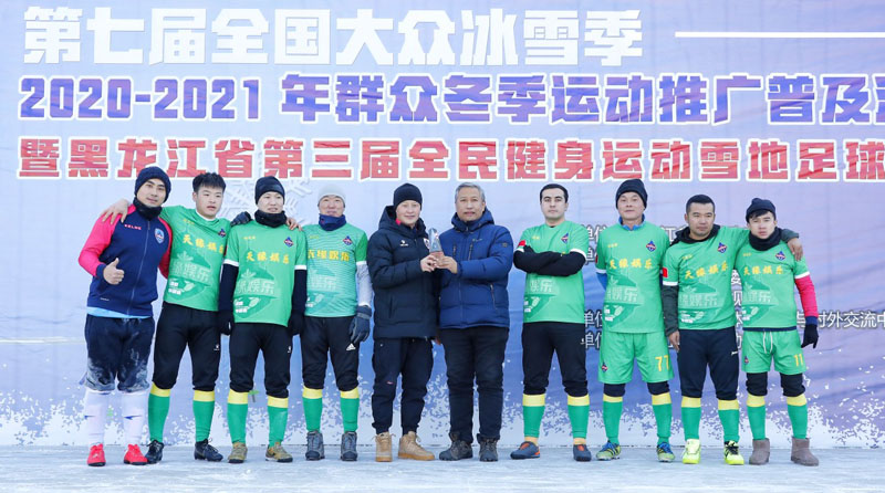 12月21日,第七届全国大众冰雪季2020-2021年群众冰雪运动推广普及活动暨黑龙江省第三届全民健身运动雪地足球比赛在哈尔滨哈南市民健身广场结束。经过两天的比赛,来自哈尔滨的天缘足球队在决赛中以3比0战胜大庆飒动足球队摘得冠军。